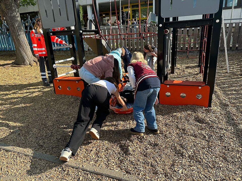 Alle Schüler:innen der 6. Klassen müssen sich verpflichtend im Rahmen des Unterrichts mit dem Thema Katastrophenschutz und Katastrophenvorsorge beschäftigen. So soll die allgemeine Resilienz für den Fall der Fälle gestärkt werden. Die Hilfsorganisationen unterstützen diesen Tag mit spannende Einblicke in deren Arbeit. Deshalb waren wir am 18.04.2026 extra an der Ferdinand-Steinbeiss-Realschule wo 220 Schüler:innen einen Einblick in die Blaulichtorganisationen gewinnen konnten. An vier Stationen luden wir die Kinder zum Schnuppern und Mitmachen ein. So konnte ein Blick in unsere beiden Katastrophenschutzfahrzeuge geworfen und anhand vieler Bilder die Arbeit des DRK im Katastraophenschutz dargestellt werden. Außerdem mussten die Gruppen als Team einen Trageparcour mit Rikscha und Schleifkorbtrage bewältigt werden. Ohne Teamwork funktioniert es nirgends. Nur zusammen ist man im Ernstfall stark. Vor allem bei den Mitmachstationen waren die Kinder mit großem Engagement dabei. Beteiligt waren neben unserem Ortsverein noch die THW Ortsgruppe Bietigheim-Bissingen und die DLRG Ortsgruppe Vaihingen/Enz. Die Aktion wurde von der FSR gemeinsam mit der OMRS Kleinglattbach und der Schloßbergschule Vaihingen durchgeführt.